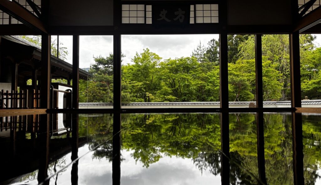本堂に上がり、磨き上げられた床をのぞき込むと、外の新緑がそのまま映り込んでいて、まるで鏡のよう。