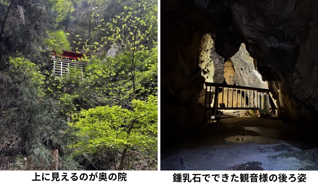 洞窟の中には、鍾乳石でできた観音様の後ろ姿。